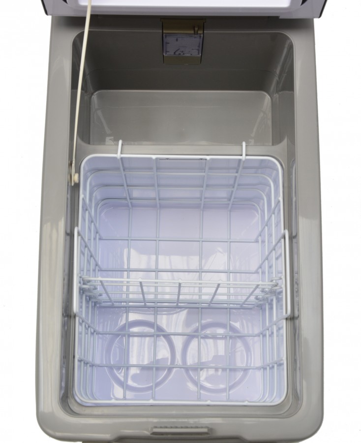 Vnitří hrubý objem 50 litrů umožňuje umístění 1,5 a 2 litrových lahví nastojato a pojme vše potřebné na Vaši cestu. Pro pohodlnější manipulaci je zde drátěný koš, který umožňoje vyjmutí obsahu lednice a snadné přenesení, také zabraňuje přimrzání ke stěnám. Výparník je hliníkový (perfektní tepelná vodivost, korozivzdornost, nízká váha). Vnitřní prostor je rozdělen na dva: pro hluboké zmražení (samozřejmě jde o teplotu, kterou si nastavíte) ca 31l a pro chlazení ca 6,5l. V koši je odnímatelná přepážka viz připojené obrázky.