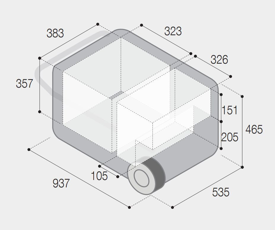 Vnější rozměry v/š/h: 465 x 937 (včetně výsuvného madla) x 535 mm