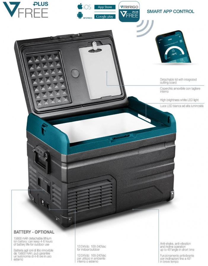 Vitrifrigo VFP 60 (série chladniček Vitrifrigo VFREE PLUS) je vybavena hermeticky uzavřeným kompresorem s integrovanou řídící jednotkou, ochranou baterie proti vybití, nastavitelnou ve třech stupních, elektronickou ochranou proti přepólování, možností bezdrátového ovládání / sledování pomocí smartphonu a možností dokoupení interní napájecí baterie.