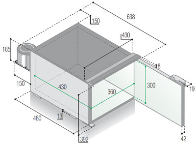 Vnitřní rozměry cca (délka x hloubka x výška): 360 x 430 x 300 (viz obrázek v galerii)