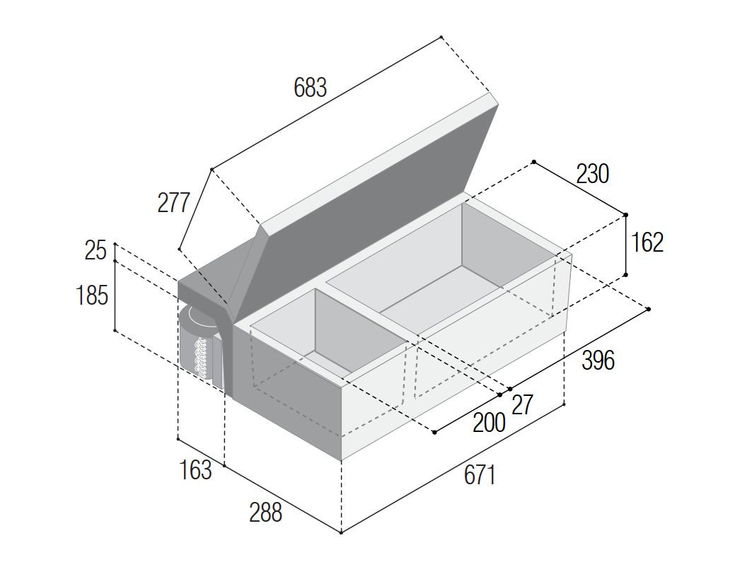 Vnitřní rozměry cca (délka x hloubka x výška mm): 396 x 230 x 162 + 200 x 230 x 162 (viz obrázek v galerii)