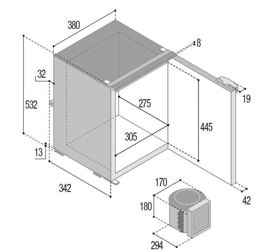 Vestavná chladnička s volnou chladící jednotkou, kterou tak lze snadno umístit například vedle chladničky, nebo do místa s lepší ventilací atp. Objem chladničky je 42 litrů, z toho mrazící přihrádka (mrazáček) má objem 3,6 litrů.