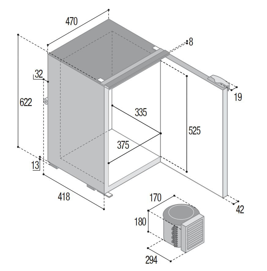 Vestavná chladnička s volnou chladící jednotkou, kterou tak lze snadno umístit například vedle chladničky, nebo do místa s lepší ventilací atp. Objem chladničky je 75 litrů, z toho mrazící přihrádka (mrazáček) má objem 10,2 litrů.