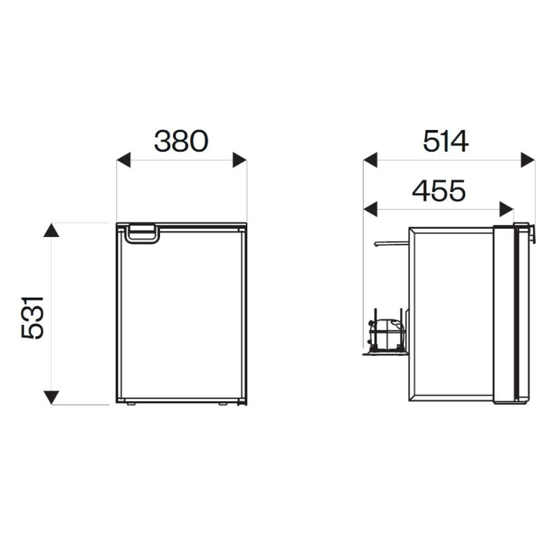 Rozměry (v/š/h) mm: 531 / 380 / 499 (354 mm chladnička +145 mm kompresor), (minimální zástavbová hloubka pro tzv. předsazenou montáž: 310 mm - bez kompresoru)