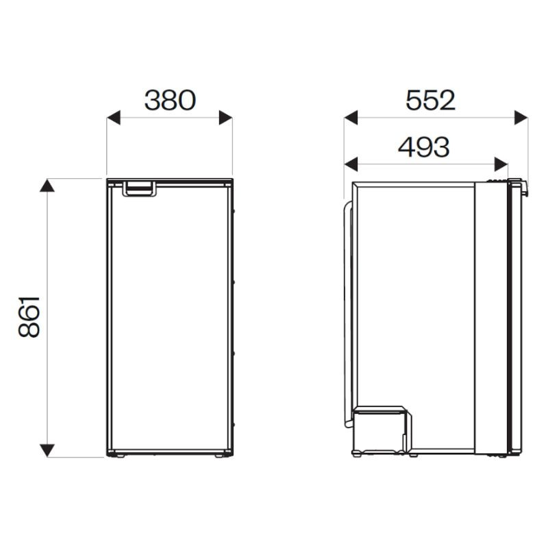 Rozměry vnější (v/š/h) mm: 861 / 380 / 532 (minimální zástavbová hloubka pro tzv. předsazenou montáž: 493 mm, hloubka detauilně: tělo chladničky 510 mm, trubka chlazení ca 30 mm, klika dveří ca 22 mm)