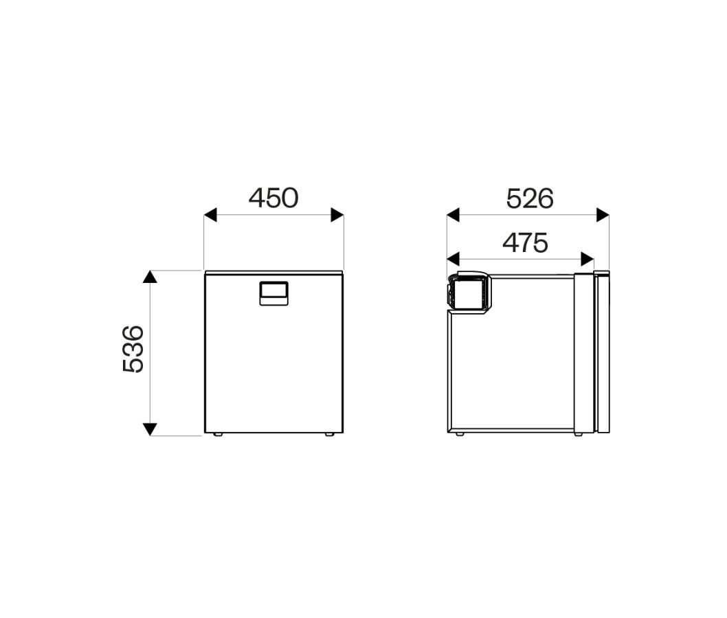 Objemem 65 litrů se DR65 řadí do kategorie menších či středních chladniček o rozměrech: šířka 450 mm, výška 536 mm a hloubka 526 mm, umožňují snadnou zástavbu do menších interiérů obytných dodávek, minikaravanů a například nástaveb na OFF road pickupy. Necháte-li dveře předsazeny před okolní nábytek, bude Vám dokonce postačovat hloubka pouhých 475 mm.