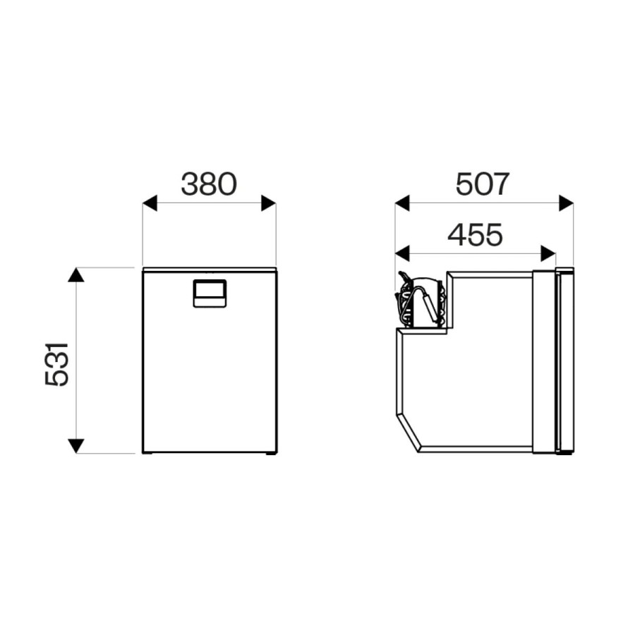 Rozměry (v/š/h) mm: 531 / 380 / 507 (362 mm chladnička +145 mm kompresor), (minimální zástavbová hloubka pro tzv. předsazenou montáž: 455 mm - bez kompresoru)
