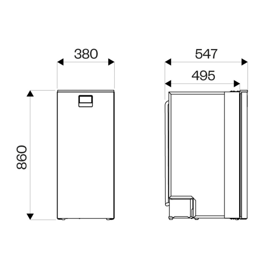 Rozměry (v/š/h) mm: 860 / 380 / 547 (minimální zástavbová hloubka pro tzv. předsazenou montáž: 495 mm - bez kompresoru)