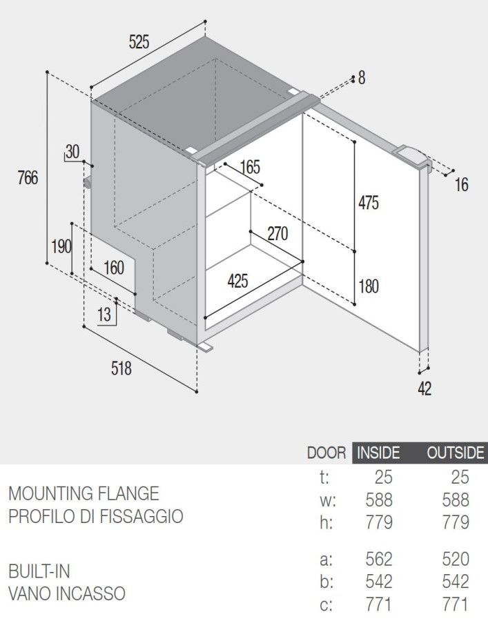 Vestavná chladnička Vitrifrigo C115i CHR s pevnou chladící jednotkou. Celkový objem chladničky je 115 litrů, z toho mrazák má objem 17,1 litrů.
