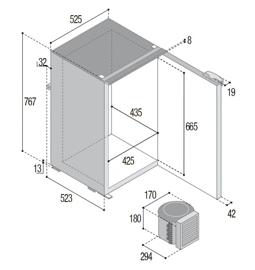 Vestavná kompresorová autochladnička Vitrifrigo C130L CHR s volnou chladící jednotkou, kterou lze snadno umístit například vedle chladničky, nebo do místa s lepší ventilací atp. Celkový objem chladničky je 130 litrů, z toho mrazák má objem 17,1 litrů.