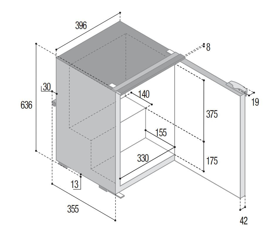 Vestavná chladnička s pevnou chladící jednotkou. Objem chladničky je 50 litrů, z toho mrazící přihrádka (mrazáček) má objem 3,6 litrů.