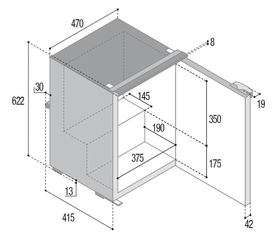 Vestavná chladnička s pevnou chladící jednotkou. Objem chladničky je 60 litrů, z toho mrazící přihrádka (mrazáček) má objem 10,2 litrů.