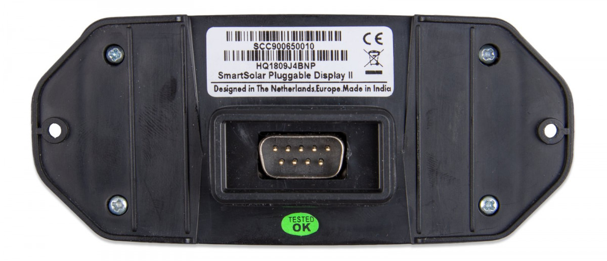 Displej SmartSolar Control je připojitelný LCD displej pro solární regulátory SmartSolar (SMART Solar 150/45-150/100 a 250/60-250/100). Stačí vyjmout gumové těsnění, které chrání zástrčku na přední straně regulátoru a připojit displej.