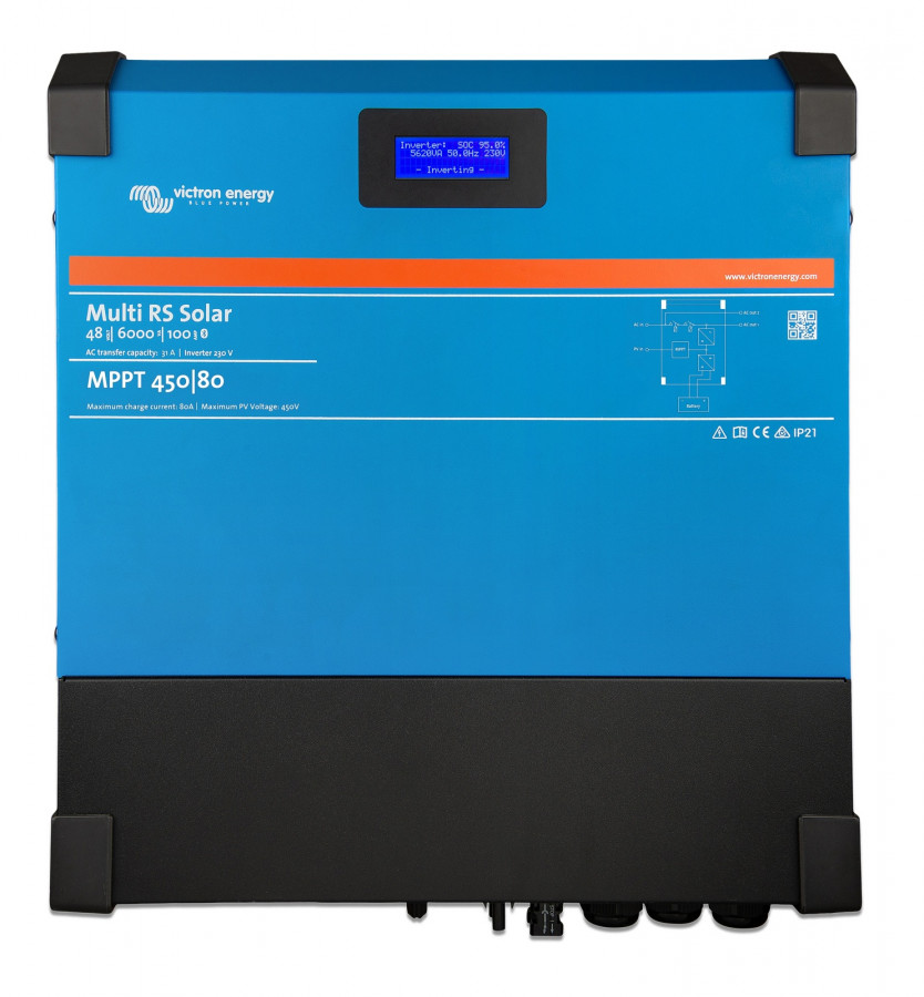 Multi RS Solar 48/6000 je 48 V 6 kVA střídač/nabíječka s 450 VDC 2x3 kWp FV vstupem.