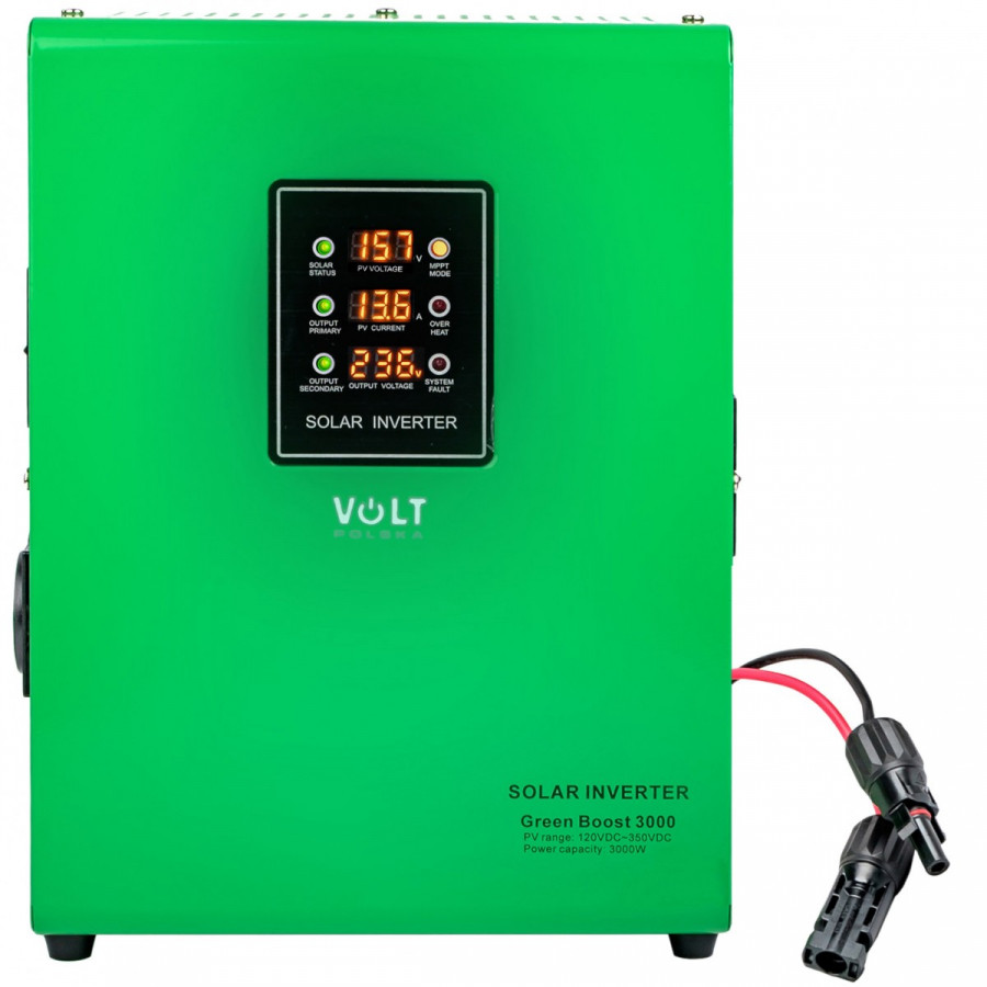 Regulátor GREEN BOOST 3000 je vybaven na vstupu proudovým jističem pro odpojení solárních panelů. Regulátor má dva výstupy, které jsou určeny pro topná tělesa o napětí 230 VAC (výkon až 3 kW). Po připojení dostatečného napětí z FV panelů začne měnič napájet topné těleso připojené na výstupu 1, do výstupu 2 lze zapojit další spotřebič, který začne být napájen po vypnutí spotřebiče v zásuvce 1.