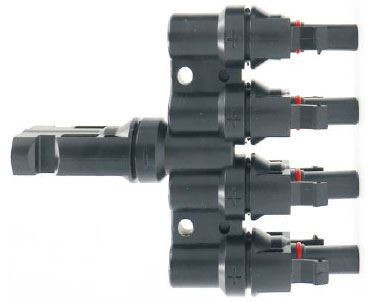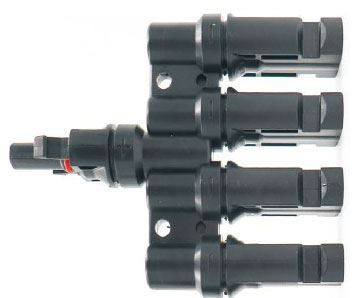 Pár, samec + samice MC4 konektory, čtverný slučovač. Používá se nejčastěji pro paralelní spojení čtyř větví PV panelů do jedné.