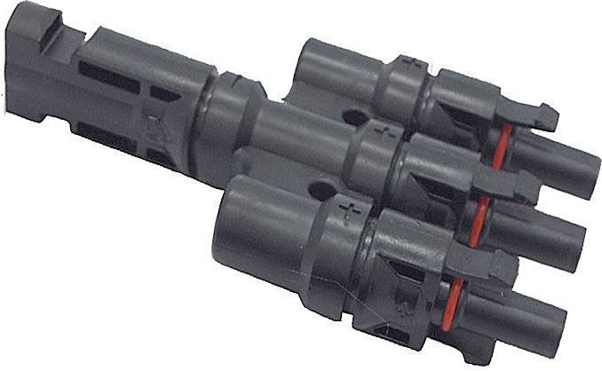 Pár, samec + samice MC4 konektory, trojitý slučovač. Používá se nejčastěji pro paralelní spojení tří větví PV panelů.
