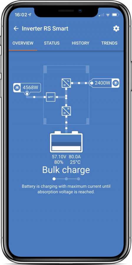 Střídač je vybaven displejem pro čtení údajů o baterii a střídači. Tyto parametry lze také načíst přes Bluetooth pomocí aplikace VictronConnect. Kromě toho lze střídač pomocí portu VE.Can připojit k zařízení GX pro monitorování systému.