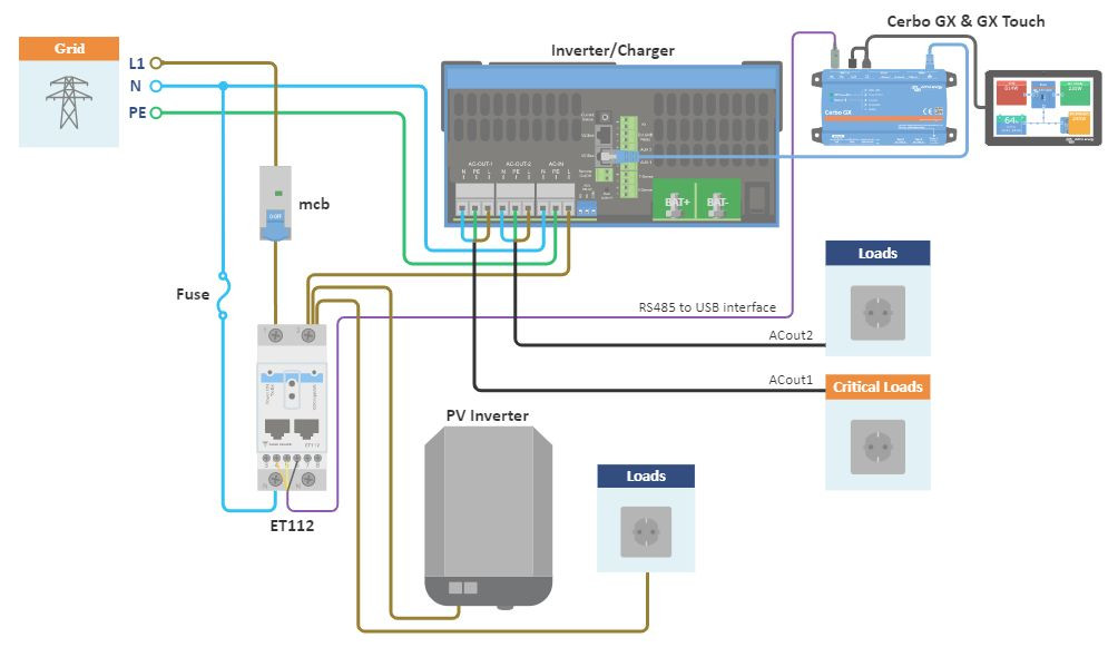 Victron ET112 je standardní zařízení pro měření výkonu a energie jednofázové aplikace (max 100A), například na rozvodné skříni nebo pro měření výkonu FV střídače, AC generátoru nebo výkonu střídače a střídače/nabíječky.