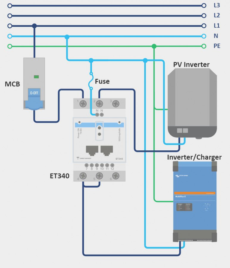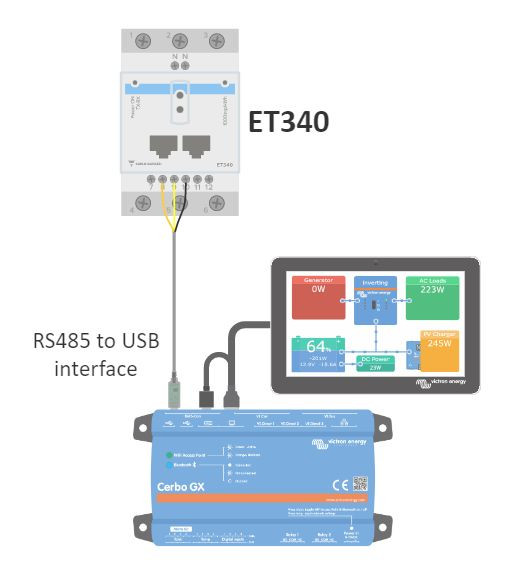 Victron ET340 je standardní zařízení pro měření výkonu a energie třífázové aplikace (max 65A na fázi), například na rozvodné skříni nebo pro měření výkonu FV střídače, AC generátoru nebo výkonu střídače a střídače/nabíječky.
