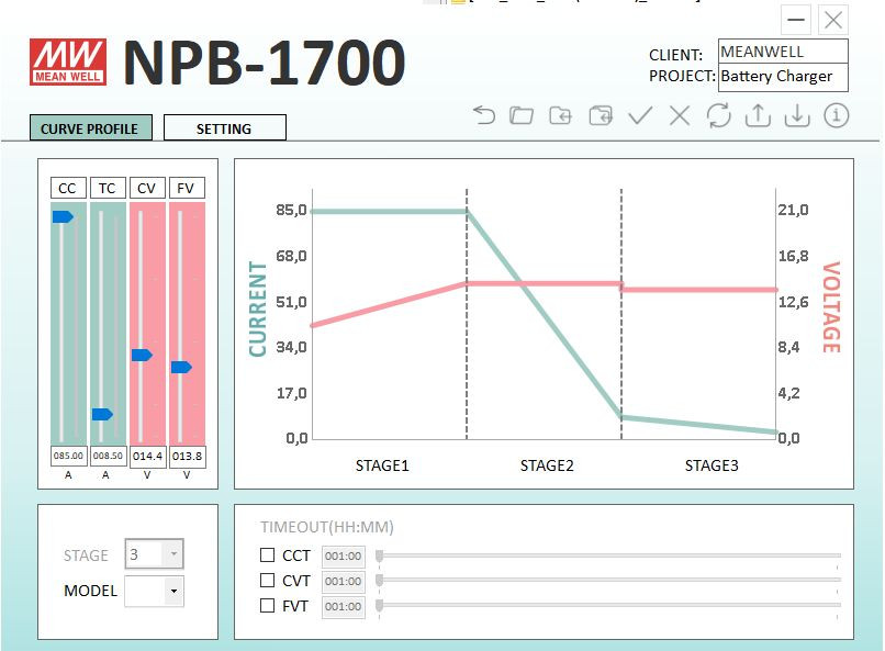 Rozsah nabíjecího napětí každého modelu je dostatečně široký, aby pokryl různá napětí baterie a chemického složení baterie, a má vestavěný inteligentní režim nabíjení s detekcí napětí (Poznámka: Tento režim je ve výchozím nastavení z výroby nastaven na VYPNUTO a je vhodný pro Lithiové baterie s BMS). NPB-1700 lze spárovat s programátorem MEAN WELL SBP-001 pro digitální konfiguraci, jako je výběr 2/3stupňového nabíjení, nastavení nabíjecího napětí/proudu a nastavení doby nabíjecího cyklu pro ochranu životnosti baterie.