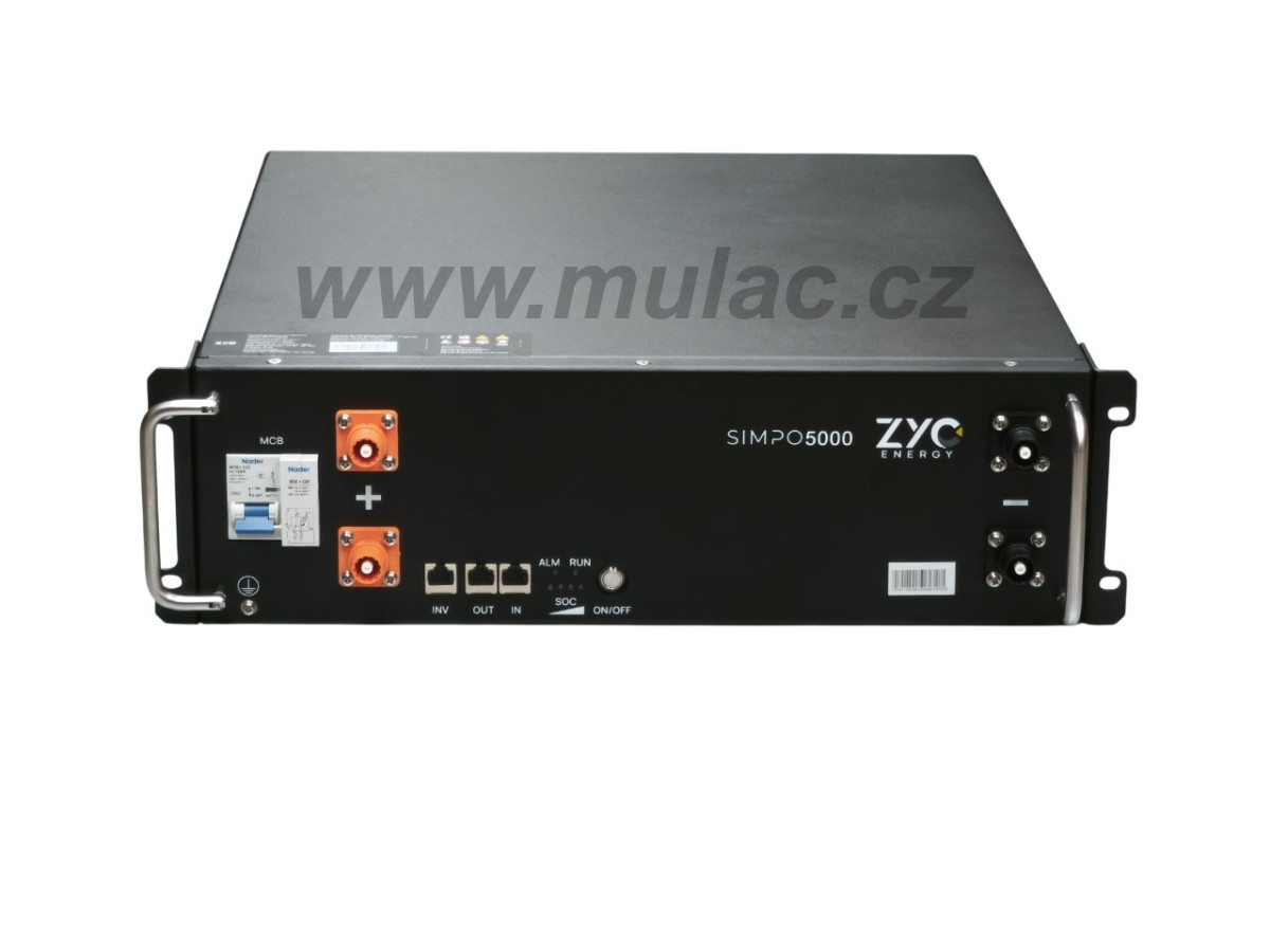 Profesionální, průmyslově sestavená baterie SIMPO 5000, kompatibilní se systémem Victron Energy. LiFePO4 bateriový modul pro fotovoltaiku o napětí 51,2 V a využitelné kapacitě 100 Ah (5,12 kWh).
