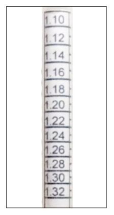 • Měřicí rozsah: 1.10 až 1.32 g/ml