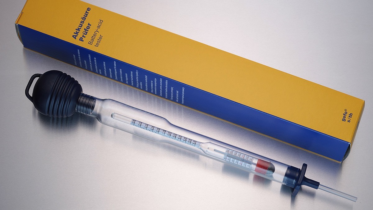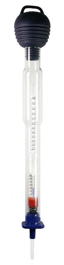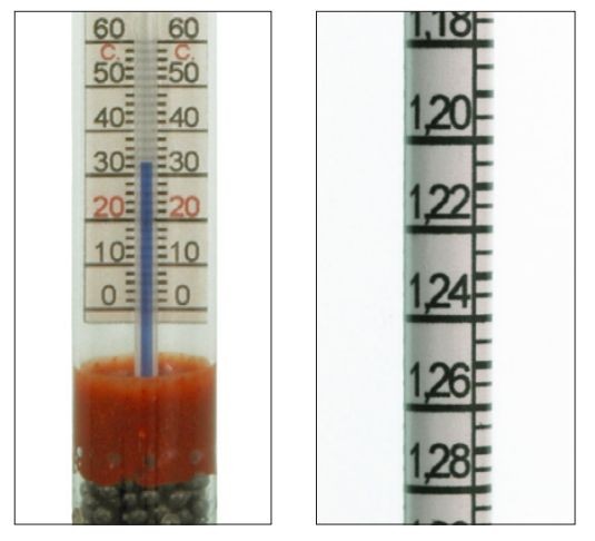 Přesný skleněný hustoměr německého výrobce GEFO pro profesionální užití zejména měření hustoty staničních baterií s vysokým nárokem na přesné odečtení hustoty. Plovák je vybaven teploměrem pro zohlednění teploty