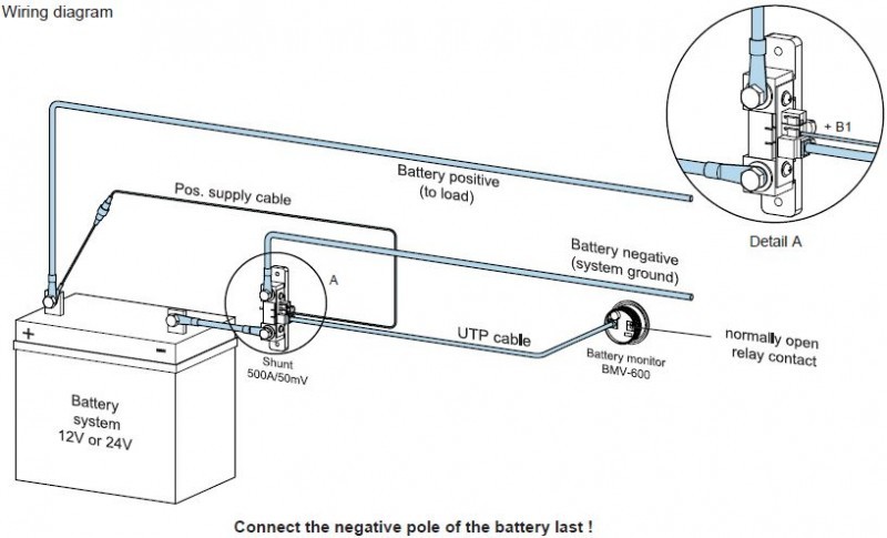 • Jednoduché propojení: sledovač stavu BMV-700 je dodáván s bočníkem (shunt 500A/50mV), 10 metry komunikačního kabelu s kroucenými páry RJ12 UTP a s 2 metry instalačního kabelu k baterii s pojistkou. Nejsou potřeba žádné jiné součástky.