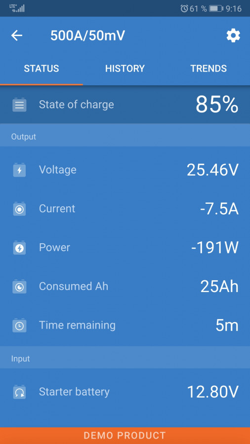 SmartShunt se připojuje přes Bluetooth k aplikaci VictronConnect v chytrém telefonu (nebo tabletu) a pohodlně si můžete přečíst všechny sledované parametry baterie, jako je stav nabití (aktuální kapacita baterie), aktuální nabíjecí proud, nebo vybíjecí proud, zbývající čas do vybití, historické informace a mnoho dalšího.