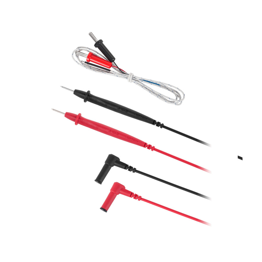 Součástí balení jsou měřící kabely s hroty, termo sonda s článkem typu K a také baterie.